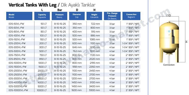 Разширителен хидрофорен съд EDS-150VL-PW със сменяема мембрана, обем 150 литра, мембраната е изработена от EPDM и е подходяща за санитарни нужди, максимално налягане 10 бара, фабрично налягане 3 бара, присъединителен размер 1 цол. двойно боядисан с полиуретанова боя и епоксидно покритие, дебелина на материала 1,5 мм, поцинкован фланец, стойка и крака от метал, без ръждясване по заварките, вертикален монтаж, цвят син RAL 5015, опакован в здрав цветен кашон, с манометър, размери 1 085 х 500ф мм, произход EDS Global, Турция.