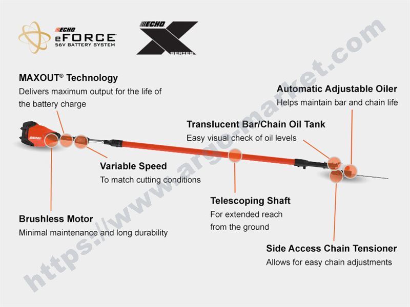 Професионална прътова кастрачка Echo, 56 V, стъпка на веригата 0,325, 1,1 мм, шина 25 см, телескопичен прът от 480 до 610 см, работа до 75 мин(200 рязания) с батерия 4,5 Ah, тегло 6 кг, цената не включва батерия и зарядно, произход 100% Япония.
