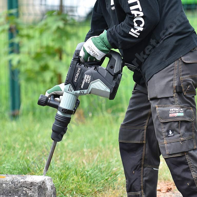 Къртач Hitachi, монофазен 230 V/50 Hz, мощност 1 500 W, сила 20 J, честота на удара 1500-2100/мин, електронно регулиране на оборотите, антивибрационна система, захват SDS Max, смазване с грес, застопоряване на секача на 12 позиции, куфар, тегло 17,5 кг, произход Япония.