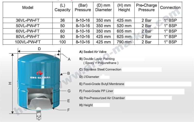 Разширителен хидрофорен съд EDS-150VL-PW-FT с фиксирана мембрана, без нужда от смяна на мамбрани, обем 150 литра, мембраната е изработена от butyl и е подходяща за санитарни нужди, максимално налягане 10 бара, фабрично налягане 2 бара, присъединителен размер 1 цол от неръждаема стомана, двойно боядисан с полиуретанова боя и епоксидно покритие, вертикален монтаж, гаранция 5 години, произход EDS Global, Турция.