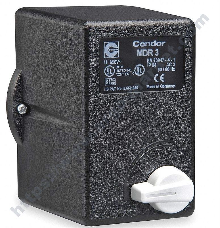 Пресостат Condor MDR 3, трифазен 400 V/50 Hz, 20 А, 4 изхода 1/4, максимално налягане 12 бара, вградена защита 16 - 20 A, размери 108 х 81 х 144 мм, тегло 0,5 кг, произход Германия.