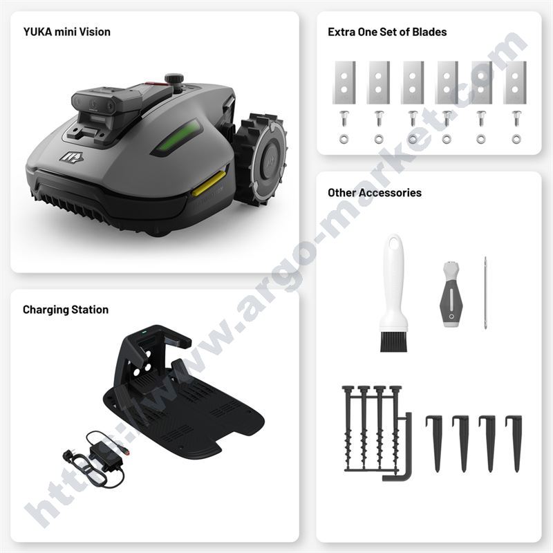 | YUKA mini 2 800 | Допълнителен комплект ножчета | Зарядна станция | Захранване за зарядна станция | Масло за смазване |